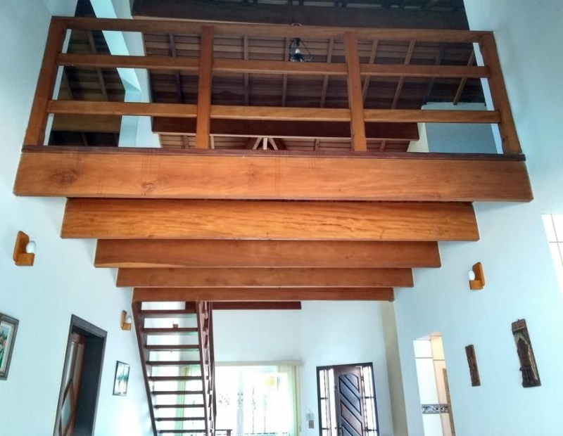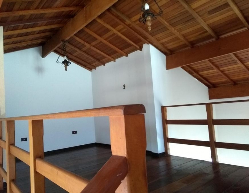 Sala ampla com mezanino, cozinha e área de serviço.