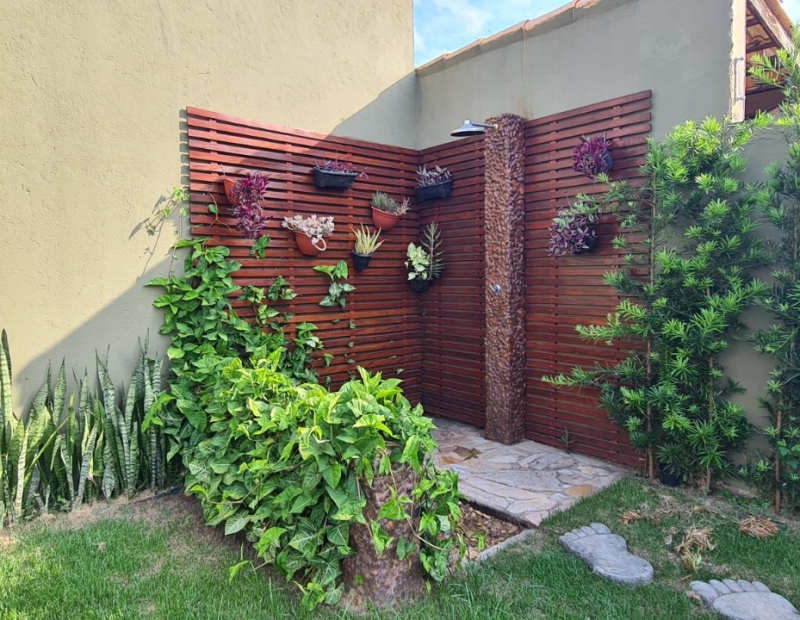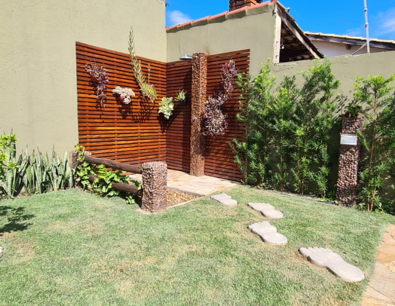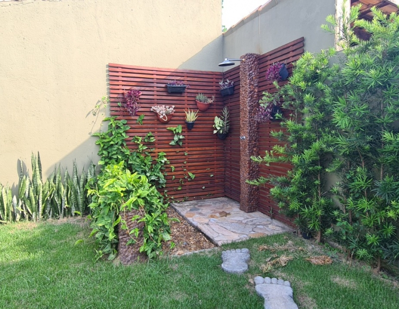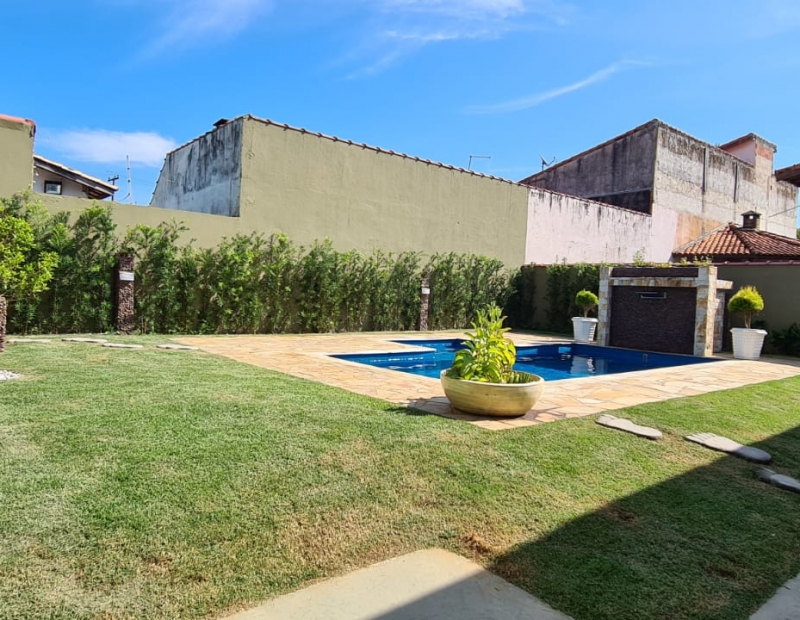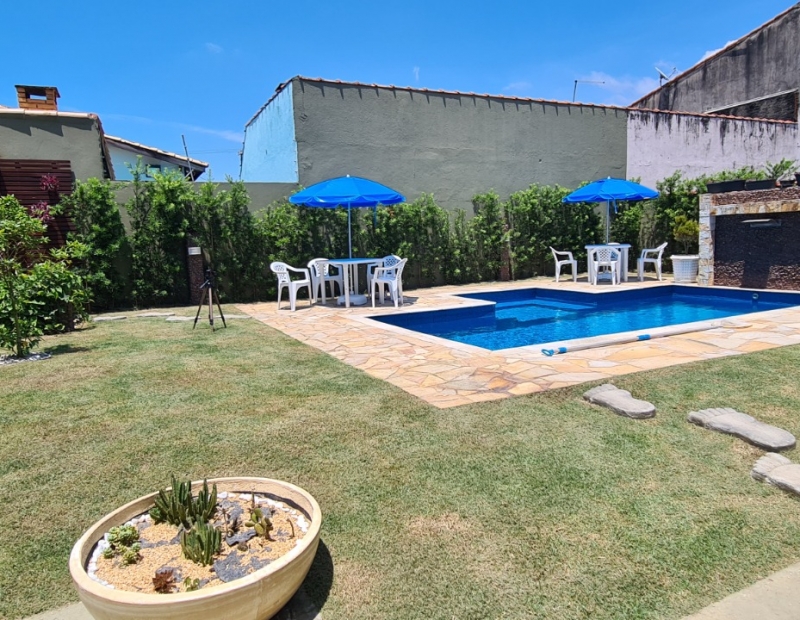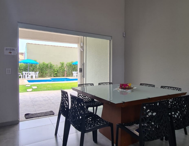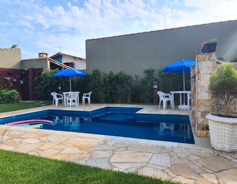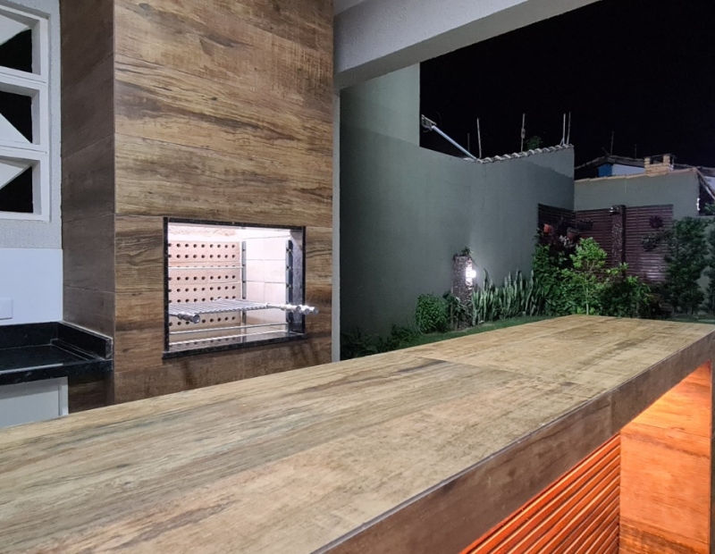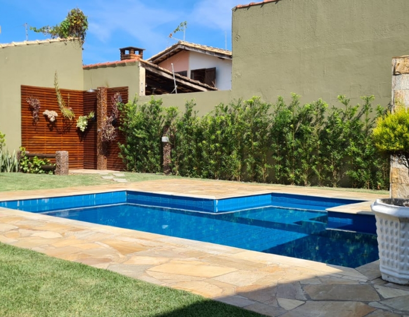 Linda área de churrasqueira com pia em granito natural e balcão com iluminação em led. Piscina de 3x6 com 1,50 de profundidade e banco molhado e um jardim de tirar o fôlego!