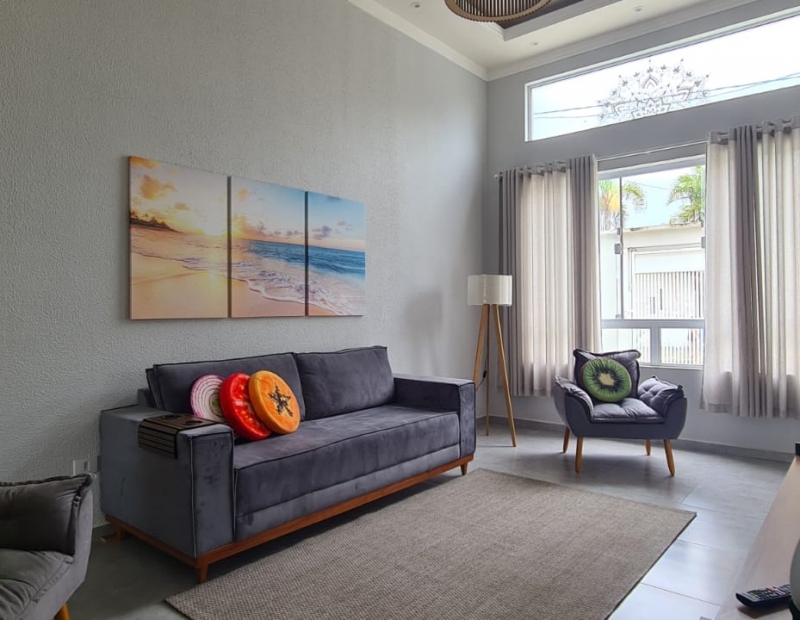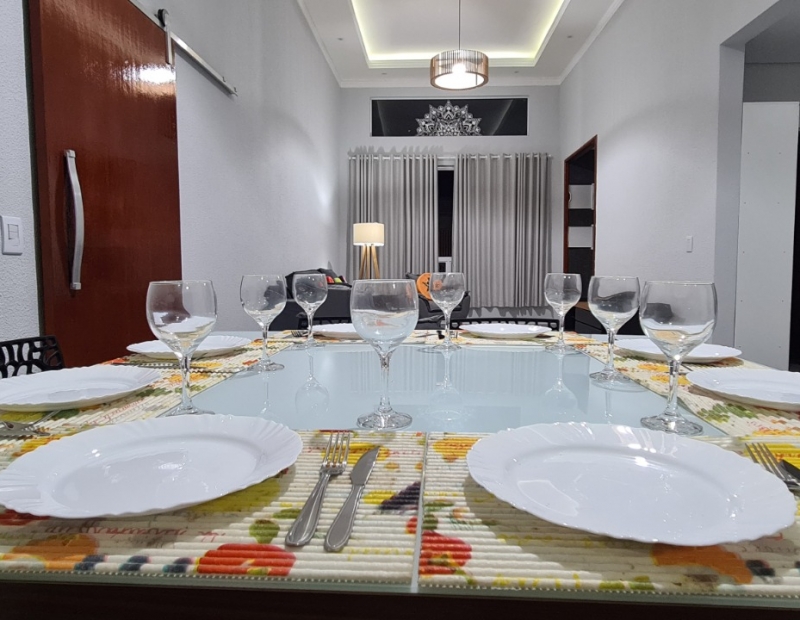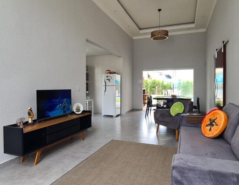São 3 dormitórios sendo 1 suíte, wc social, sala ampla com 2 ambientes, pé direito alto, medindo 3.80 metros, acabamento do teto em gesso decorativo e iluminação, janela de vidro frontal e lâmina de vidro alto, aumentando a luminosidade natural do ambiente!