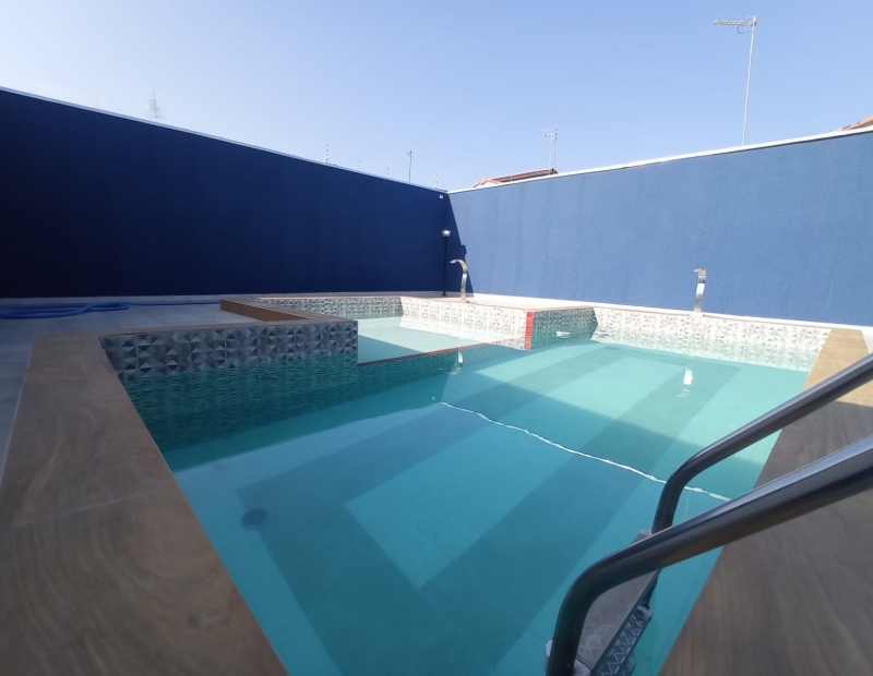 Excelente área de churrasqueira coberta, com pia já instalada. Linda piscina, com duas cascatas e banco molhado. Lavabo para atender a área externa.