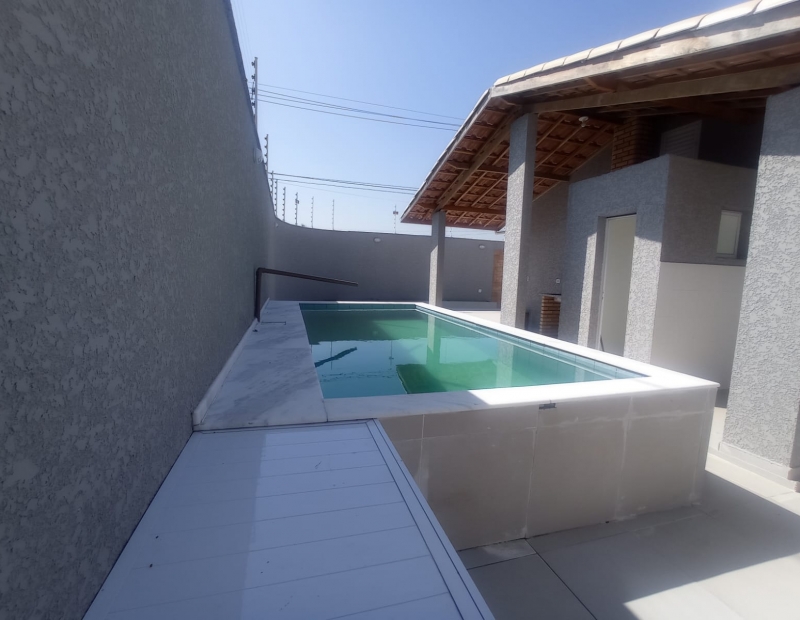 Sala e cozinha integrada, garagem para cerca de 3 veículos, área de serviço coberta, churrasqueira, ducha, lavabo para atender a área externa e piscina