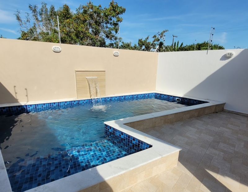Linda piscina com cascata, churrasqueira e área de serviço coberta.