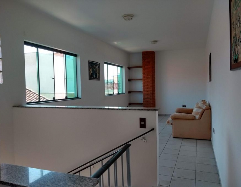 Sala ampla com mezanino, cozinha e área de serviço.