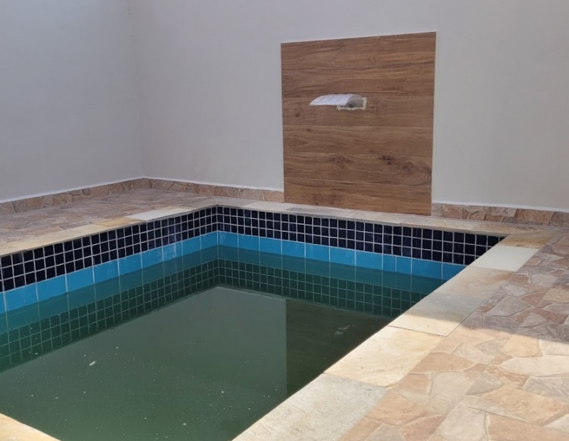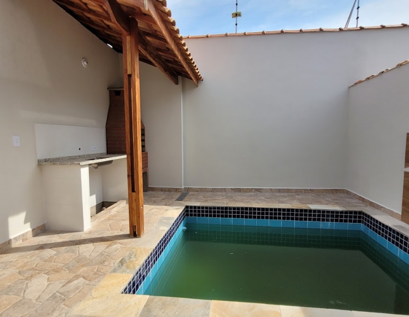 Piscina com cascata, churrasqueira e área de serviço.