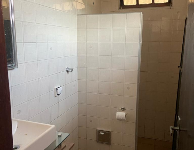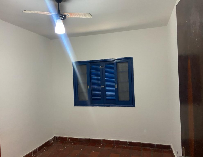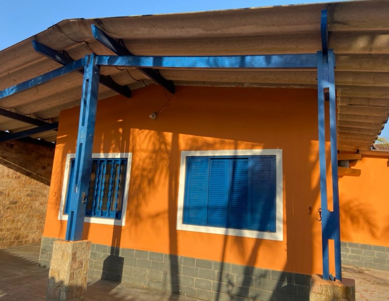 Quintal amplo com árvores frutíferas, área de serviço coberta, churrasqueira e garagem para cerca de 2 veículos.
