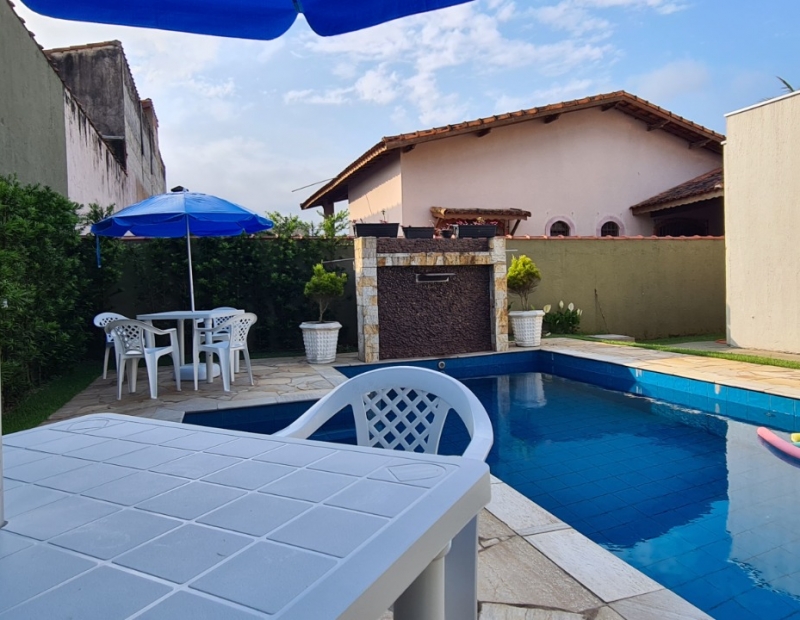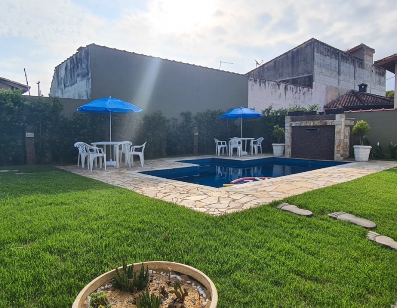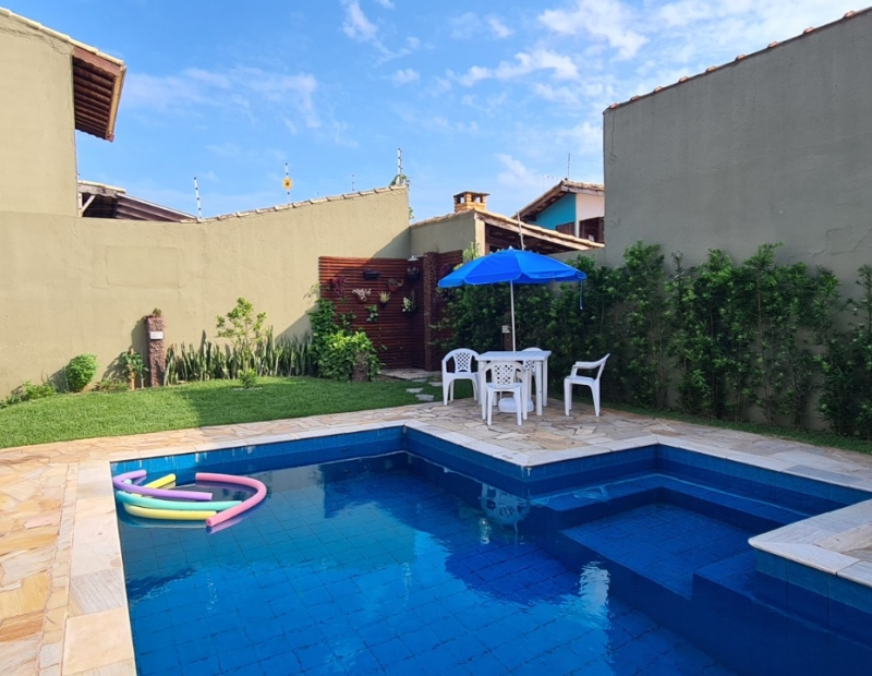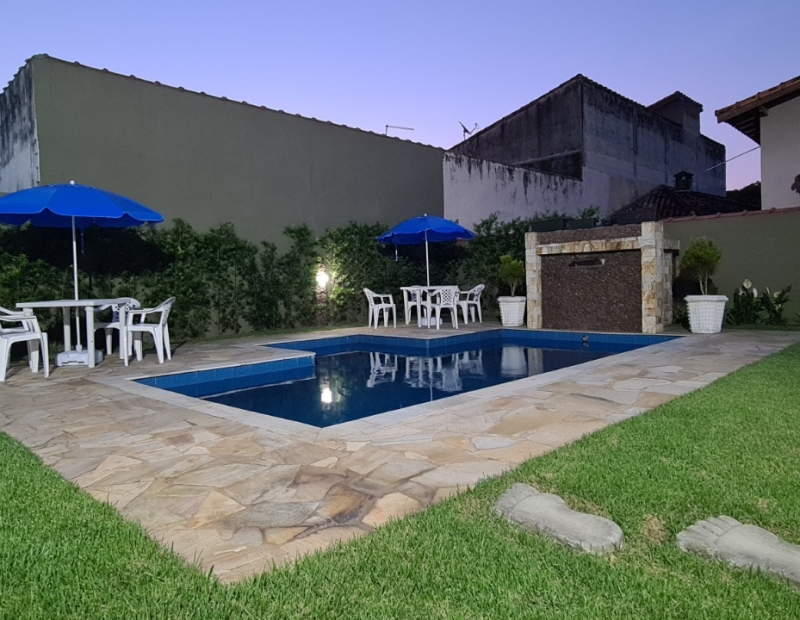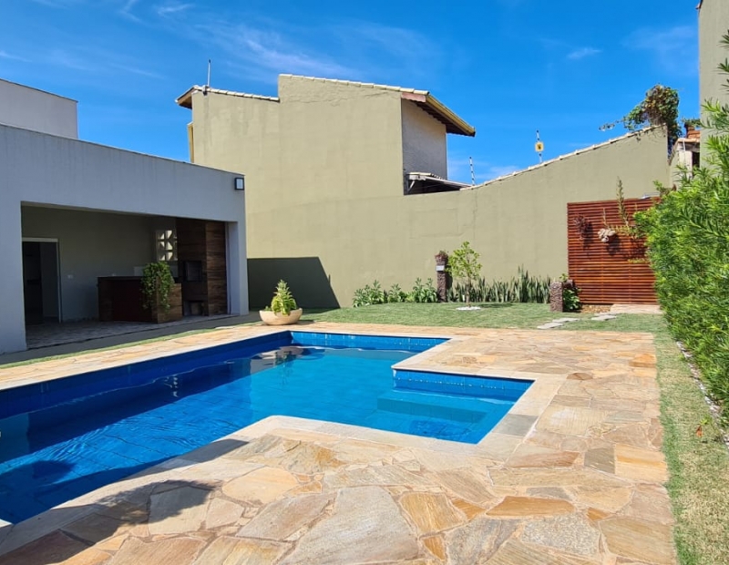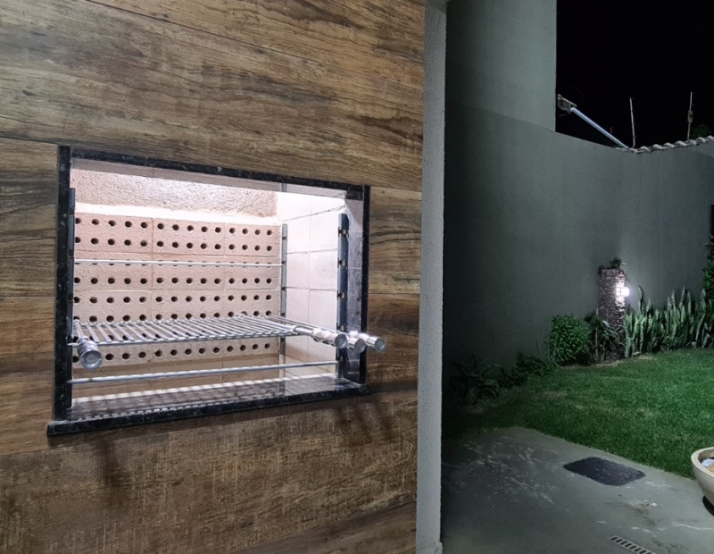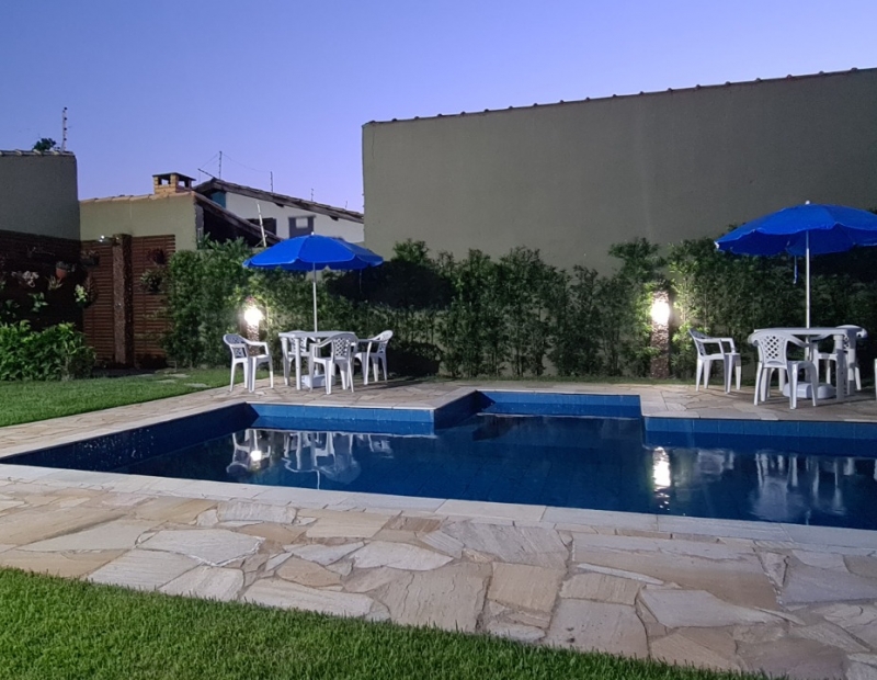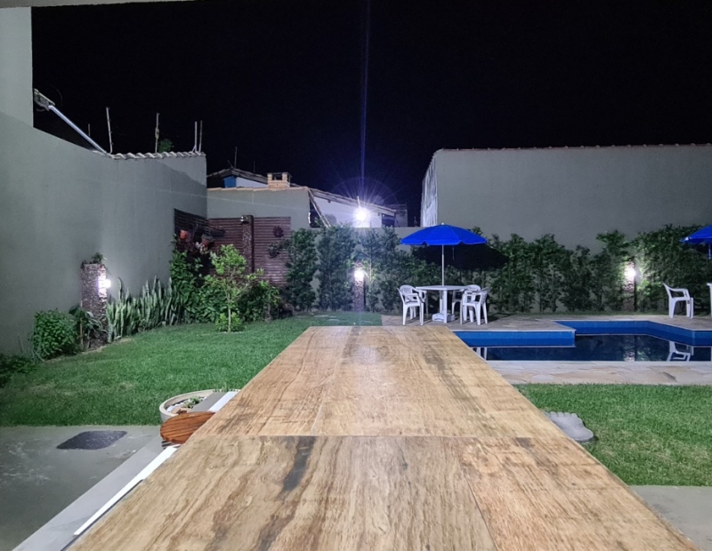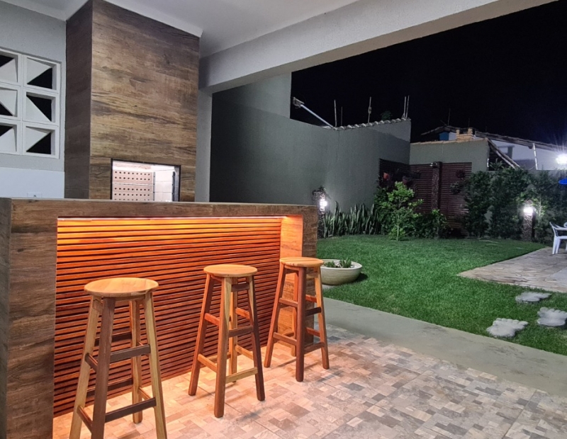 Linda área de churrasqueira com pia em granito natural e balcão com iluminação em led. Piscina de 3x6 com 1,50 de profundidade e banco molhado e um jardim de tirar o fôlego!