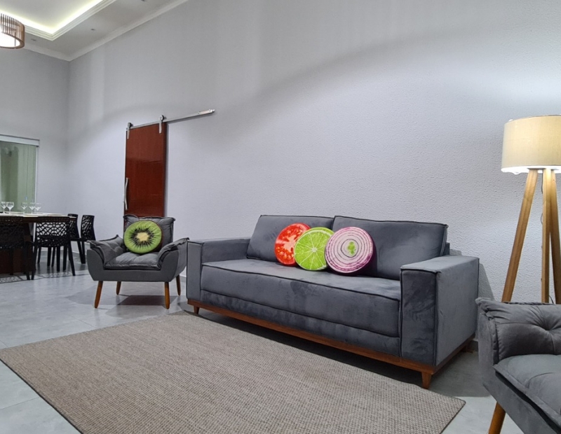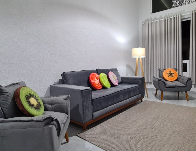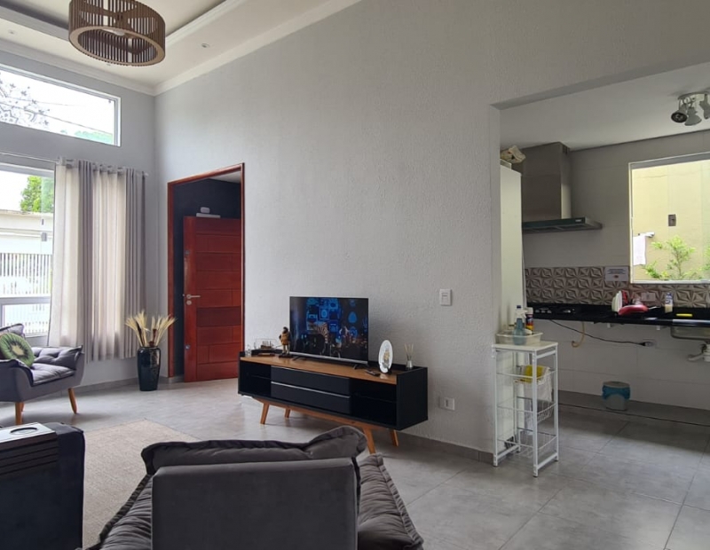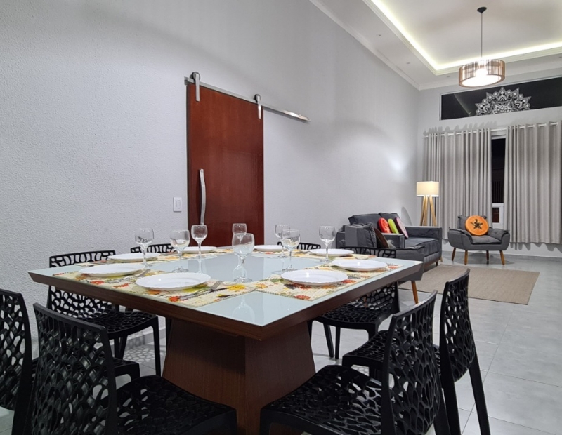 São 3 dormitórios sendo 1 suíte, wc social, sala ampla com 2 ambientes, pé direito alto, medindo 3.80 metros, acabamento do teto em gesso decorativo e iluminação, janela de vidro frontal e lâmina de vidro alto, aumentando a luminosidade natural do ambiente!