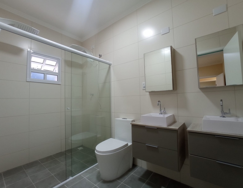 São 3 lindas suítes, uma delas possui duas pias e dois chuveiros no box. Sala ampla, integrada à cozinha. Ambientes aconchegantes e naturalmente iluminados e ventilados devido as portas de correr em alumínio branco. Lavabo interno, quintal espaçoso todo revestido em cerâmica, com garagem para cerca de 4 veículos.