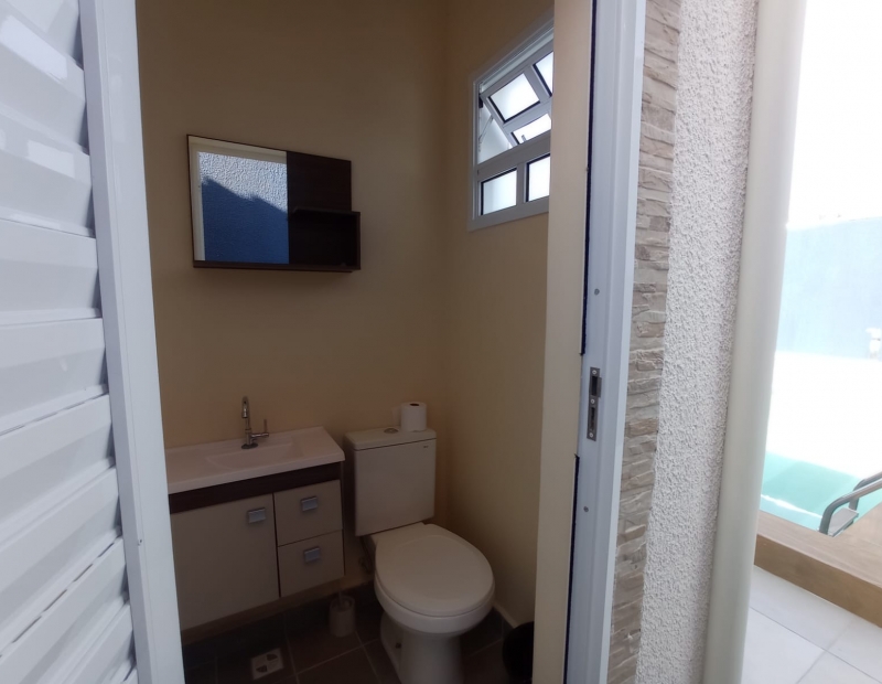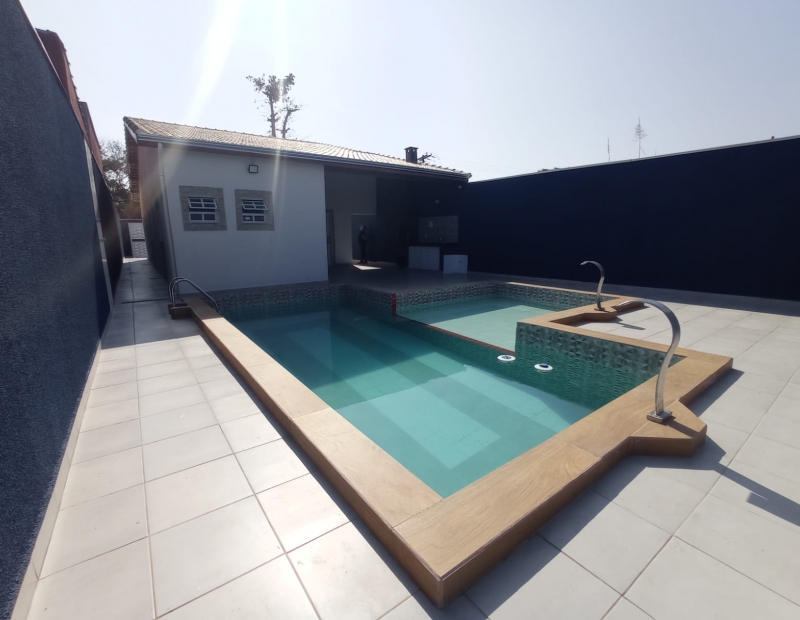 Excelente área de churrasqueira coberta, com pia já instalada. Linda piscina, com duas cascatas e banco molhado. Lavabo para atender a área externa.